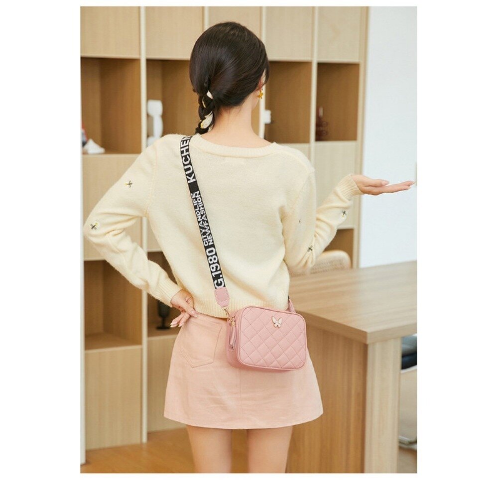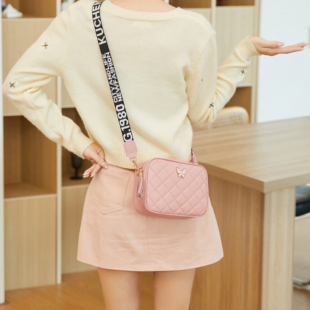 商品名稱:菱格紋優雅斜背包 女包 新款休閒 菱格繡花 蝴蝶裝飾 單肩包 流蘇肩帶 印花 斜挎 小方包 送禮