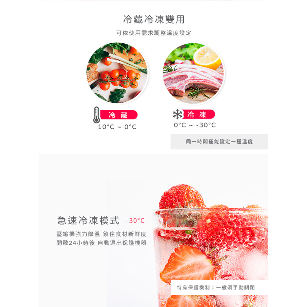 溫度調節:冷藏10~0°C;冷凍0~-30°C (預設-18°C)